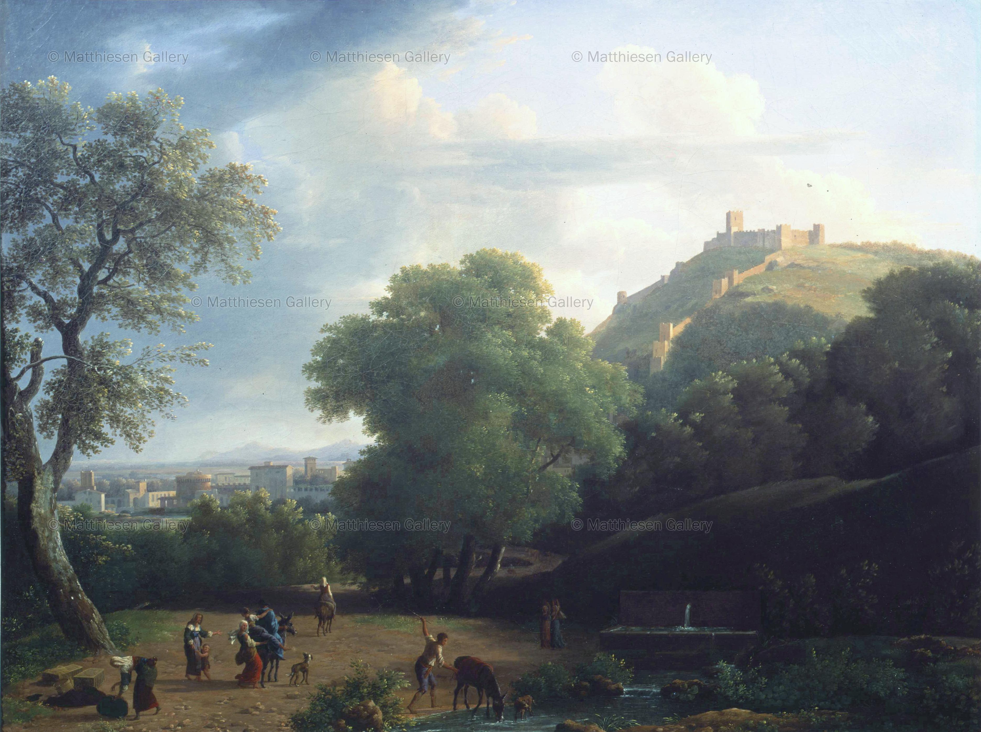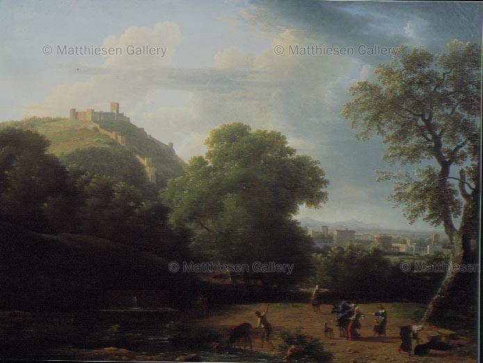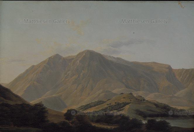Although lauded by his contemporaries Bidaulds reputation has been overshadowed by that of Valenciennes, and by the disfavor that his neo-classical landscape style fell into with the onset of the realist movement. The son of a provincial goldsmith, he received his earliest artistic instruction from his elder brother, Jean-Pierre-Xavier Bidauld (1745-1813), an undistinguished painter of landscapes and still lifes. Displaying some early talent he was admitted to the Lyon école des Beaux-Arts, studying with a friend of his brother, J.-J. Boissieu (1736-1810), spending six years in this city (interrupted by a trip to Geneva where he was exposed to the work of the Dutch 17th century painters in private collections there). In 1783 he arrived in Paris and was soon employed by the picture dealer and perfume seller Dulac who financed his trip to Italy in 1785.