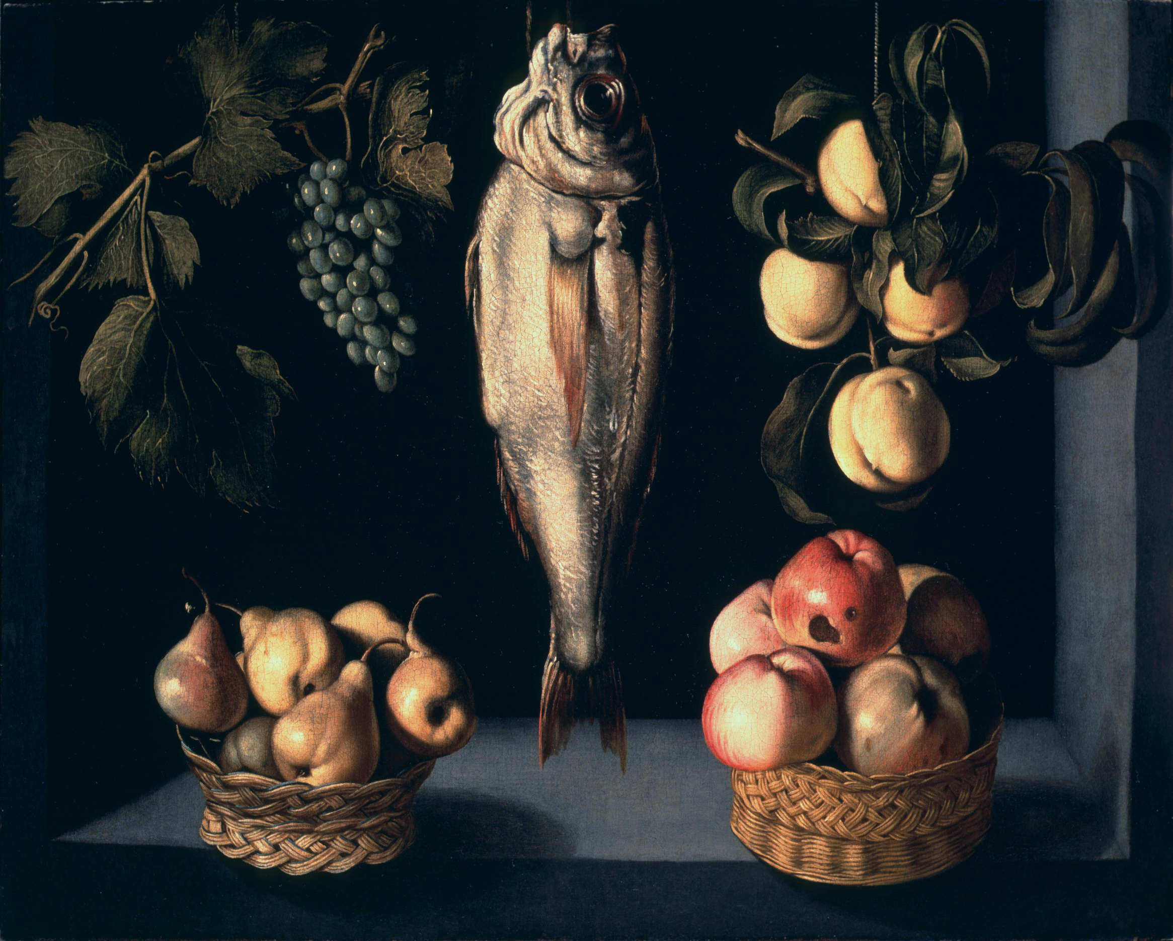 Still Life in a casement with a basket of pears and apples, a Haddock, Vine stem and a branch of peaches