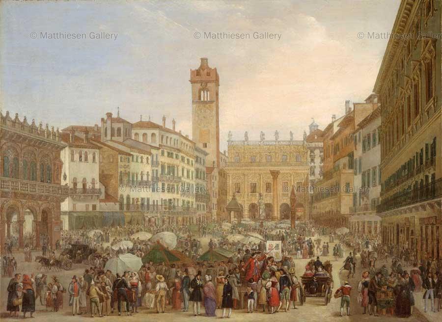 Vianelli, both a painter and print maker, made frequent trips to Paris and through out Italy sketching views and cityscapes. It is obvious from the detail in this painting of Verona that he had visited the city; the open-air market (which still operates today), medieval and renaissance buildings and Palazzo Maffei, with its statues of the Roman gods, are all meticulously recorded.