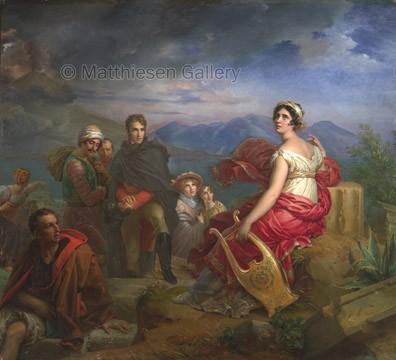 The subject matter is taken from Book XIII of Corinne ou lItalie, the celebrated romantic novel by the captivating, if sometimes notorious Madame de Staël. Published in 1807, Corinne tells the story of Oswald Lord Nelvil, a Scottish nobleman who travels to Italy following the death of his father, and there falls in love with the enigmatic beauty, Corinne, a poetess whom de Staël portrays as a sort of cross between Sappho and Petrarch by way of the Delphic mysteries. Being less of a person, that the embodiment of Italy (as seen by the French Romantic Movement), Corinne is eventually abandoned by her love in favour of her more conventional English counterpart, who as it happens turns out to be her long-lost sister. In present scene, taken from Chapter III and strikingly faithful to the text, Corinne is about to perform an evening of music and dances for Oswald upon Cape Miseno, above the Bay of Naples. Amid the festivities, Corinne is encouraged by the gathered crowd to perform as she had on the Capitoline Hill, and anxious to win Oswald’s attentions once again, she consents, but overwhelmed by the splendour of their setting, the roiling skies, and her own feminine intuition, she is suddenly overcome by emotion and foreboding. As Madame de Staël describes: