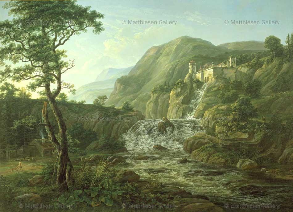 Despite its origins in the artists imagination, this painting also unites elements from other works by the artist in a composition that demonstrate his fidelity to nature, without the exaggerated symbolism of Friedrich (whom he was to meet for the first time the following year). The small figures on either side are isolated from each other by the impassable torrent, the twisted windswept birch tree and conifer clad hills conjuring up images of desolation and solitude. While the roiling waters are based on observation from life, the castle dominating the hilltop is more Germanic than Norwegian, and combined in this dramatic composition they are evidently designed to arouse the romantic sensibility. The humble cottage with smoke issuing from its chimney and the sheep scattered on the hillside below the castle remind the viewer, however, that the natural world was still subject to man. These same themes, recalled from the mountains near his childhood home of Bergen, were repeated in Rome in the 1820s when recreating his Norwegian memories (i.e. in his smaller Norwegian Mountain Landscape with Waterfall, of 1821, acquired by the sculptor in that year and now in the Thorvaldsen Museum, Copenhagen). It was works such as these that earned him the regard of his contemporaries as a painter dedicated to compromising realism. A contemporary Dresden-trained artist, A. L. Richter wrote of Dahls Norwegian landscapes: The older professors smiled openly at this heresy or folloy. The younger, however, marveled at it and imitated it as much as they could. The breath of the spring of a new time began to be felt.