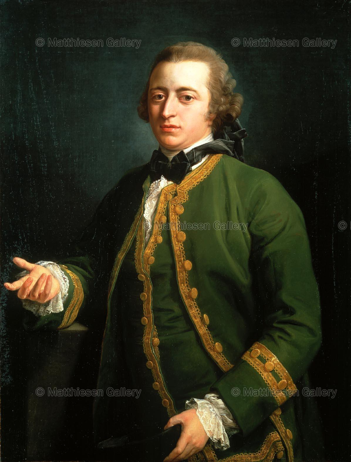 The present portrait is a fine example of Batoni’s Grand Tour portraiture and reveals, in the anatomical precision with which he delineates the features of the sitter, the crisp articulation of his hands, and the fresh and assured handling of paint, why he was the portrait painter in Rome. The subject, who remains unidentified but on the basis of his costume presumably British, wears a coat and matching waistcoat of green silk lined with lighter-weight green silk and trimmed with gold braid. He appears to be wearing his own lightly powdered hair which is styled formally (the curls set with pomatum) like a wig. By the 1760s, as Professor Aileen Ribero has noted (letter of 17th May 1985), it was permissible for a man of fashion to wear his own hair this way in lieu of a wig.