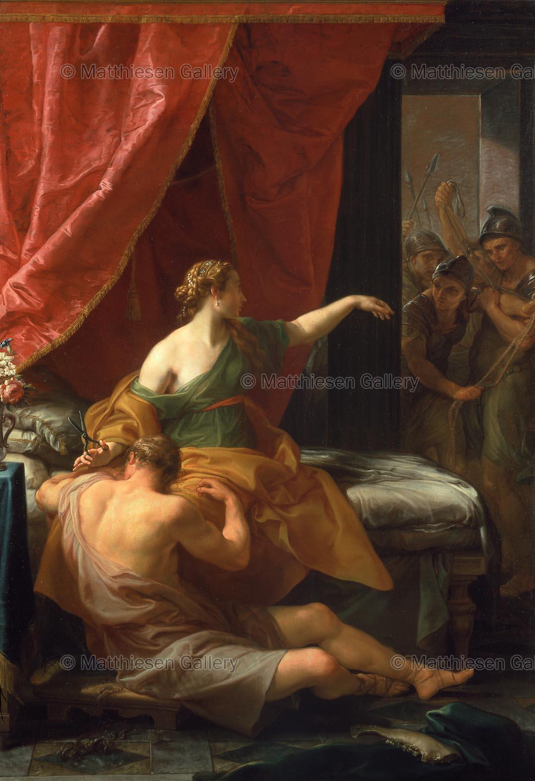 Batoni painted relatively few Old Testament subjects during his career – less than a dozen over a fifty year stretch. The reasons for this are not clear, but must certainly have something to do with the decline in popularity of Old Testament themes in the eighteenth century and the exhaustion of the mediaeval doctrine that interpreted people and events in the Old Testament as prefiguring or foreshadowing episodes in the New. The present painting together with its companion The Idolatry of Solomon, signed and dated 1766, and which appeared in the sale room in 1984 in time to be included in the publication of Anthony Clark’s research on the artist,[1] are among the most ambitious treatments of Old Testament themes undertaken by the artist. Samson’s betrayal by Delilah and subsequent downfall is recorded in Judges 16:4-20. The last of the major Old Testament judges and hero of the popular Israelite saga, Samson was a nazirite, consecrated to the God of Israel through a special vow which forbade him to take strong drink, to cut his hair, or to have contact with the dead. The episode involving Delilah reveals the consequences of Samson’s violation of this vow. Delilah, a Philistine woman he had taken as a lover, had been bribed by the Philistines to persuade Samson to divulge the source of his great strength. When he revealed that his power lay in his hair, which had not been cut since birth, Delilah lulled him to sleep in her lap, summoned a man to shear his locks, and left him a helpless prey to his enemies. Batoni, like most illustrators of the theme, has shown Delilah herself holding the scissors and summoning the Philistines outside her chamber.