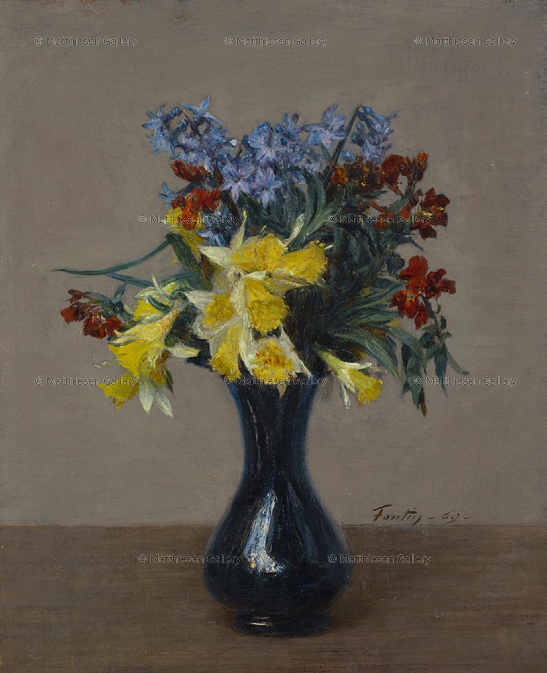 The present work, a casually assembled bunch of narcissi (Narcissus pseudonarcissus), English bluebells (hyacinthoides non-scripta) and wall-flowers (Erysimum cheiri) placed in an elegant blue glass vase, demonstrates Fantin-Latour’s technical ambition and the liberty of focus afforded by professional security. Fantin-Latour conjures leaves and petals with a lightness of touch and sensitive brush, on a canvas textured with softly layered impasto – while always respectful of conservative artistic practice he was no slave to academic tradition. In 1863 he exhibited at the Salon des Refusés, but also presented works at the Paris Salon, where he first exhibited in 1861. Reviewing Fantin-Latour’s work presented at the 1889 Salon, Émile Zola celebrated the subtlety of Fantin-Latour’s œuvre: ‘The canvases of M. Fantin-Latour do not assault your eyes; they do not leap at you from the walls. They must be looked at for a length of time in order to penetrate them and their conscientiousness, their simple truth—you take these in entirely, and then you return’ (Edward Lucie-Smith, Henri Fantin-Latour, New York, 1977, p. 37).